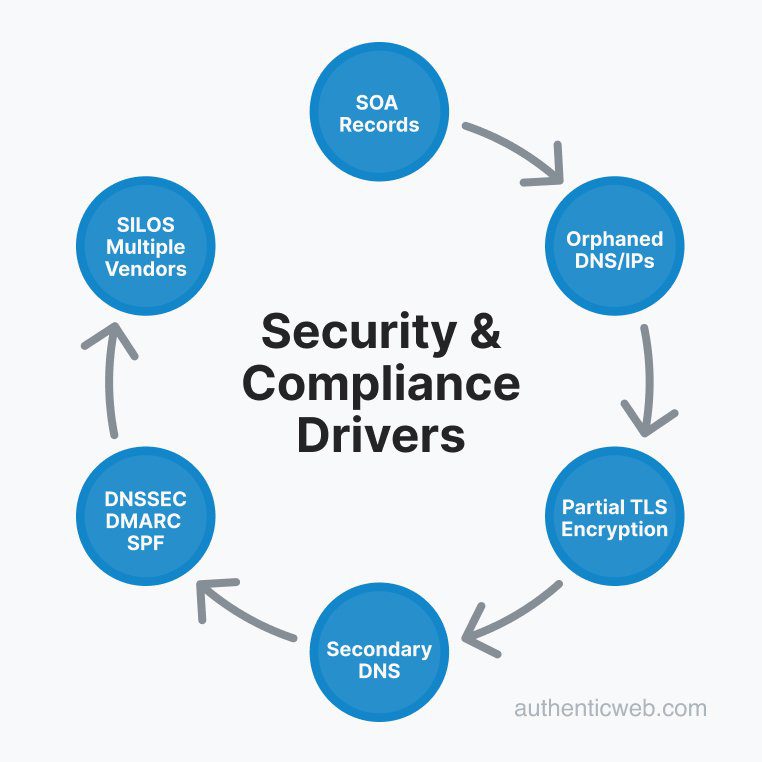 Enterprise domain and DNS management is flawed and risk-exposed in almost all large organizations. Stakeholders in IT, marketing, infrastructure, legal, and digital operations recognize that lack of control, visibility, and automation in legacy practices creates exposure. Private and public cyber-security authorities warn of known DNS network security risks. Domain and DNS hijacking, certificate compromises, appropriation of DNS controls, DNS cache poisoning, and other forms of DNS tampering are on the rise.